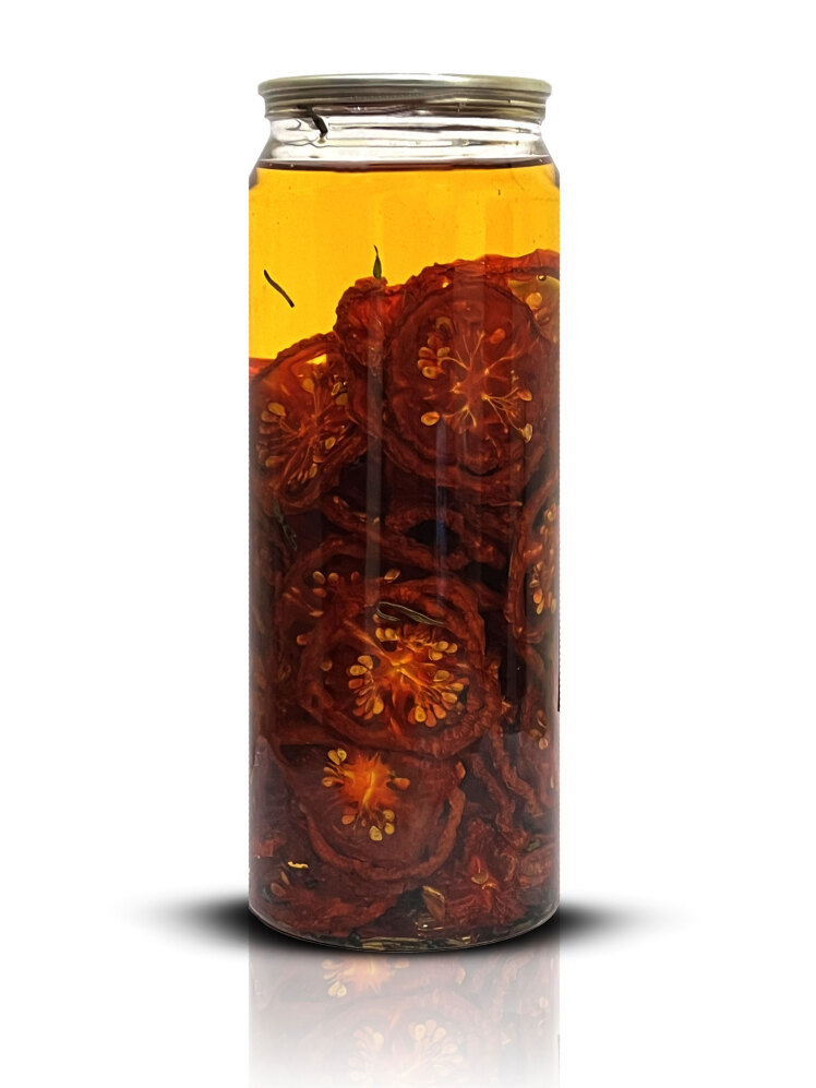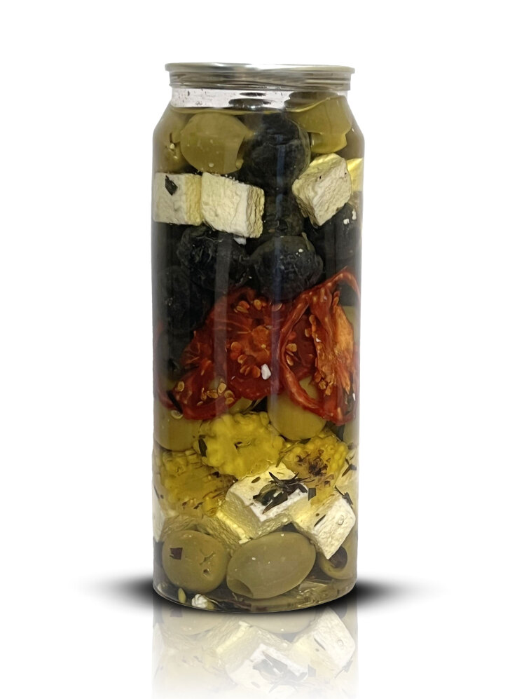 خانواده محصولات در روغن: ترکیب لوکس زیتون و پنیر (اوبا)، گوجه خشک اسلایس شده و زیتون و سیر در روغن.